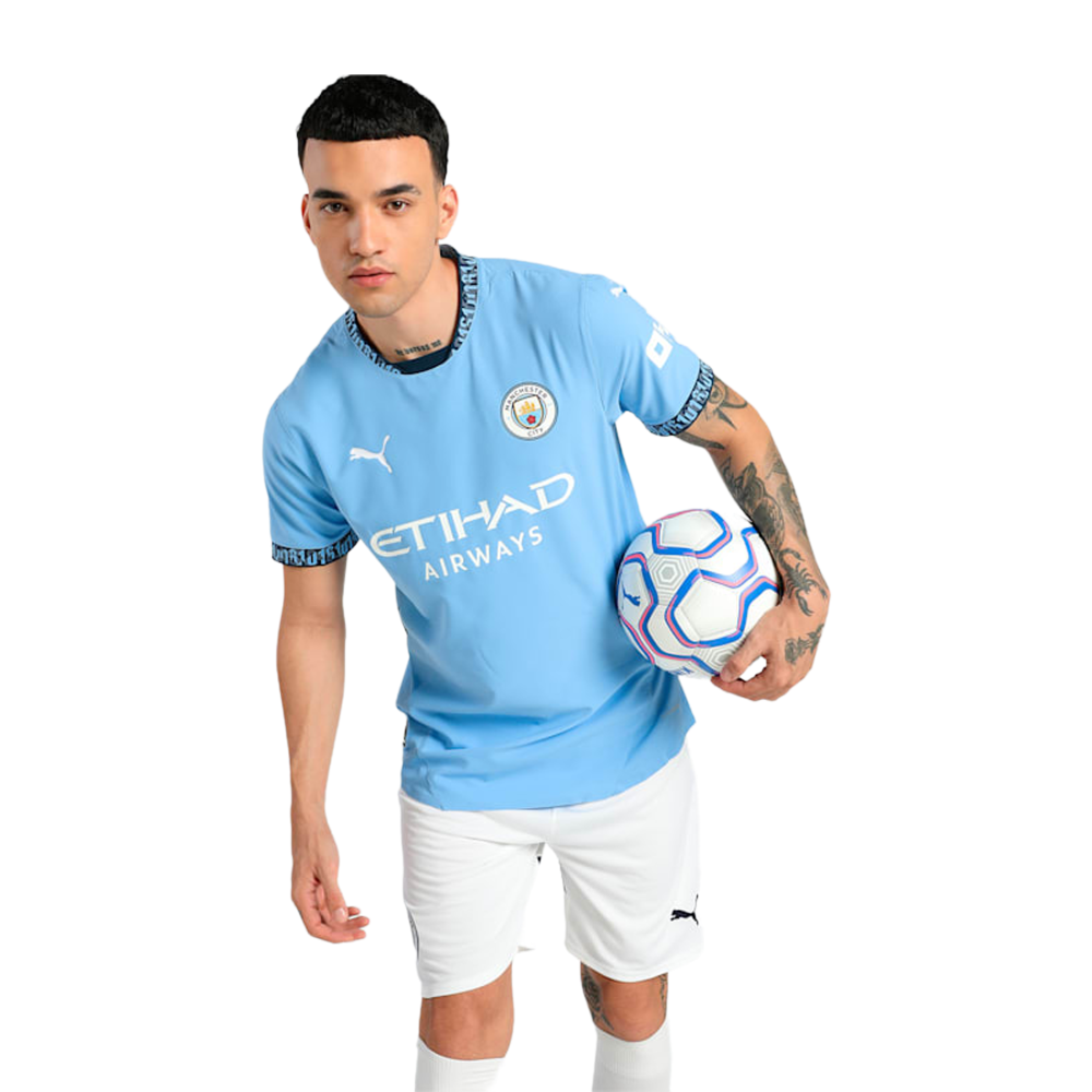 - التفاصيل: شعار مانشستر سيتي مطرز بشكل احترافي، مع شعارات الشركاء التجاريين وعلامة Puma.